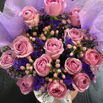 aster purple - 5 pcs pink roses - 13 pcs statice dark purple - 5 pcs