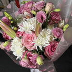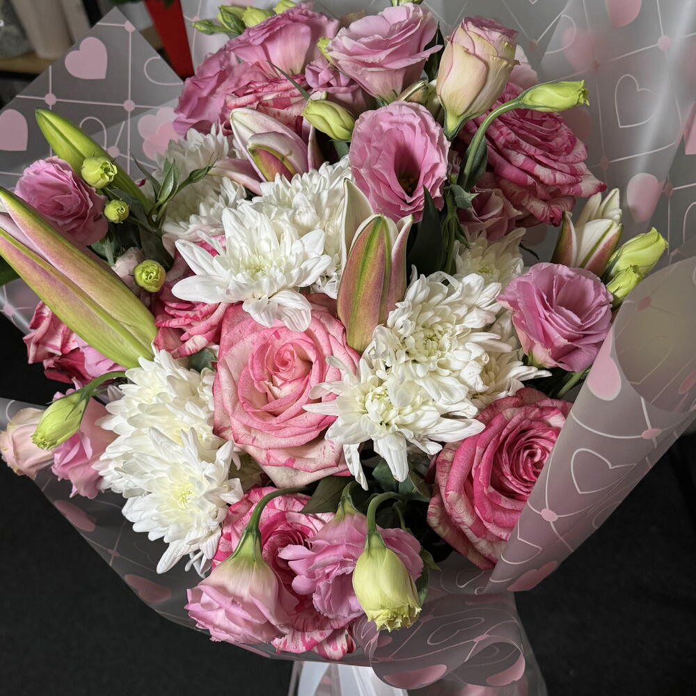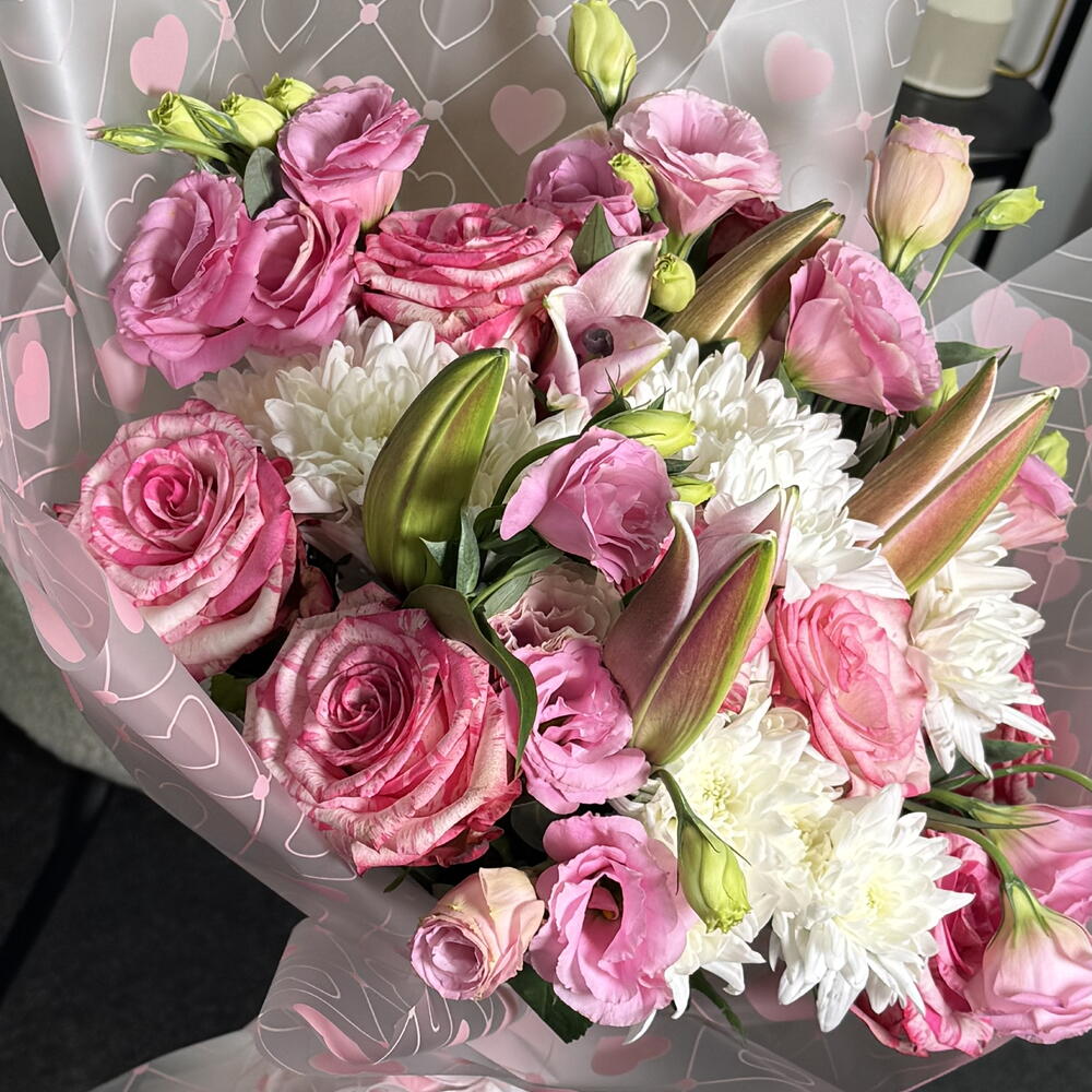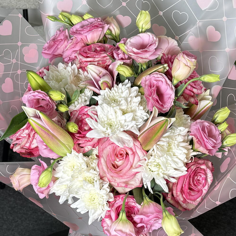 The bouquet features a harmonious mix of pink roses, pink lisianthus, white chrysanthemums, and unopened lily buds, creating a full and elegant composition. The pink tones range from blush to deeper rose shades, balanced by the crisp white blooms and touches of fresh green foliage.