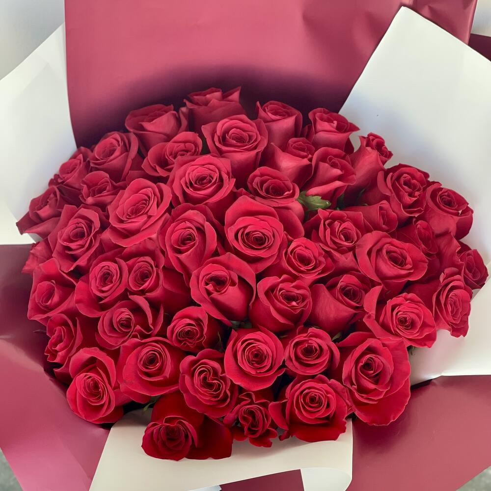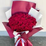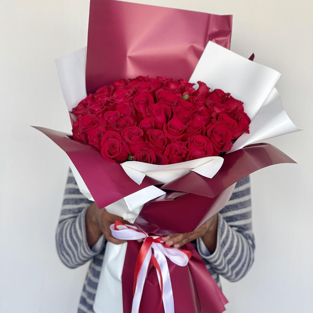 This elegant Mono Bouquet is an epitome of love and beauty. Made extraordinary with 51 pieces of radiant red Ecuador roses, it exudes a majestic charm. Its allure is heightened by the inclusion of 5 pieces each of red and white covers that impeccably protect the magnificence of the roses within. The arrangement is adorned with a red ribbon and a white ribbon, adding a final note of elegance and sophistication. This is a perfect gift that embodies passion, purity, and blissful connection.