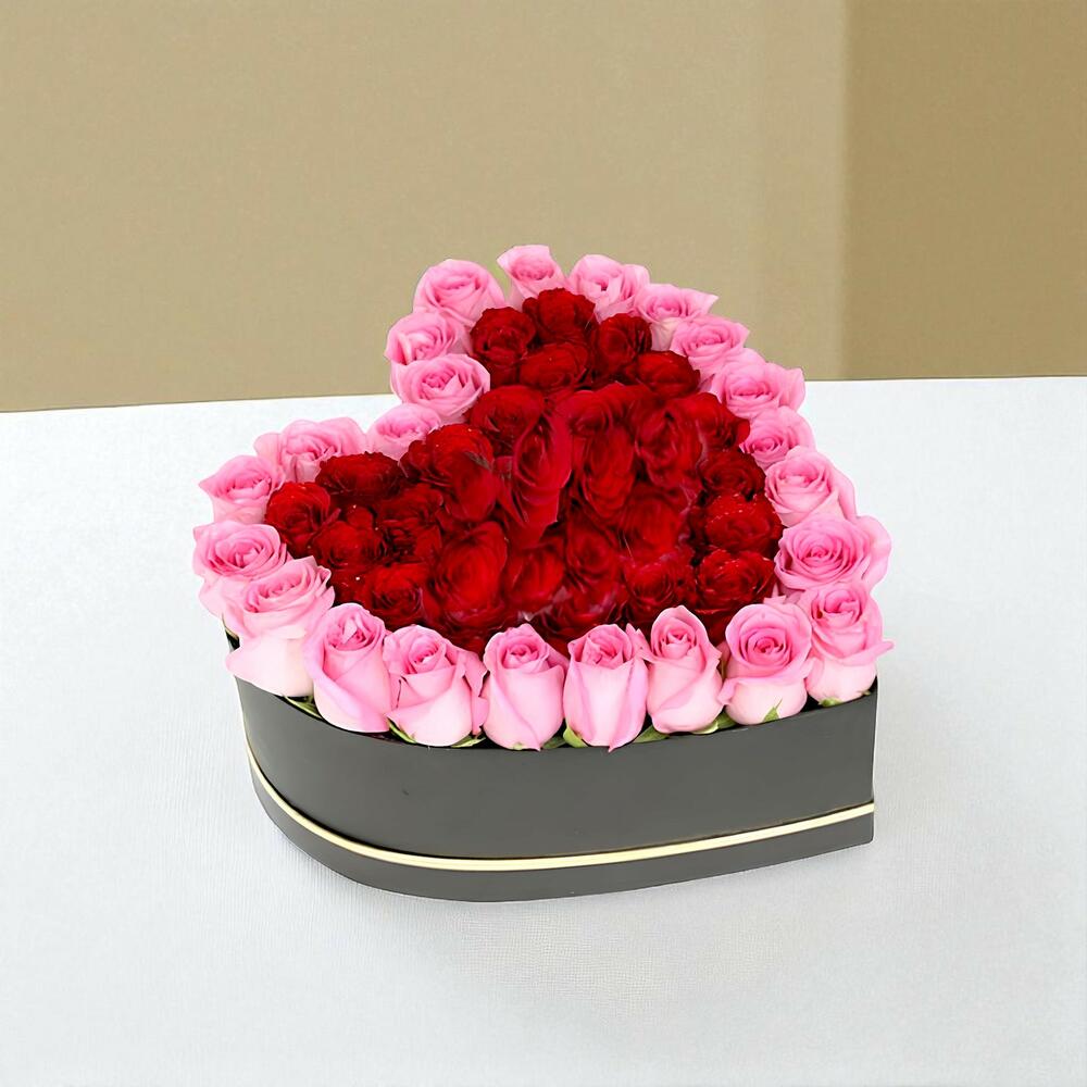 Des - Heart shape arrangement of 25 to 35 Red and Pink Roses in black box. Size 26x25.2x9.5cm