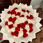 A luxurious round bouquet crafted with 25 fresh red roses, and 25 white fresh beautifully arranged to create a full and elegant look. Wrapped neatly with 10 premium white wrapping sheets and finished with a soft ribbon, this bouquet is perfect for expressing love, romance, and deep emotions on any special occasion. Contains 50 fresh roses arranged in a full, round shape Wrapped with 10 premium white wrapping sheets for an elegant finish Tied with a soft decorative ribbon to enhance presentation Ideal for romantic occasions, anniversaries, and special celebrations