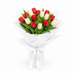 15 Red Tulips 10 White Tulips Wrapped in white paper packing Tied with a white ribbon