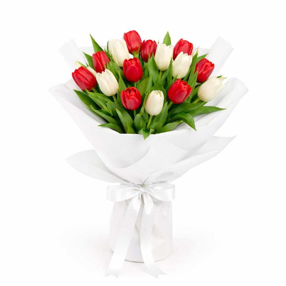 15 Red Tulips 10 White Tulips Wrapped in white paper packing Tied with a white ribbon