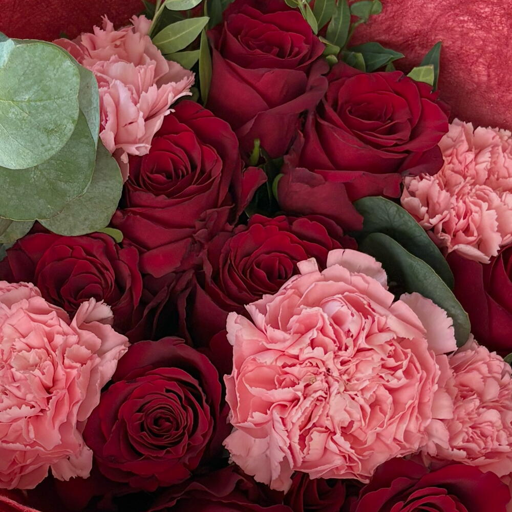 Red blush bouquet with red roses and carnations