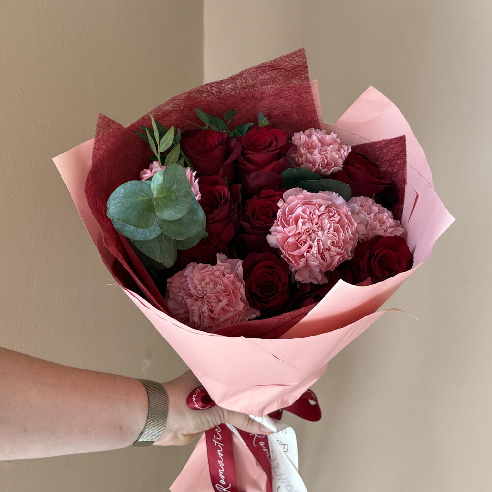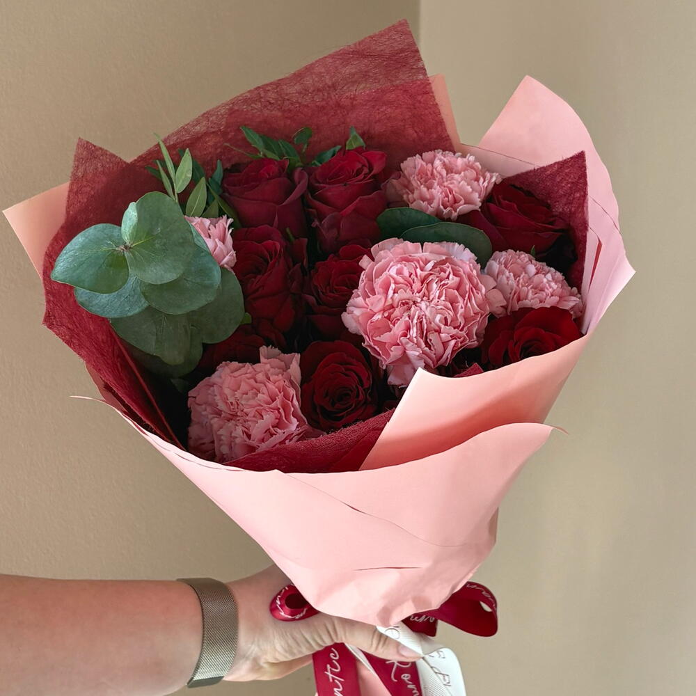 Pistachio - 1 pcs eucalyptus stems - 1 pcs wrapping paper small - 1 pcs red roses kenya - 10 pcs carnation dulcinea - 5 pcs