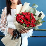 red baby roses - 17 pcs ecyliptos - 3 pcs