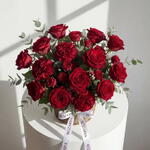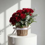 A rich and elegant basket arrangement in deep red shades, designed with classic roses, spray roses, carnations, and fresh eucalyptus. This composition looks romantic, bold, and luxurious, making it a perfect gift for Valentine’s Day, birthdays, anniversaries, and special celebrations. • Please Note: As flowers are natural products, actual colors may vary slightly from digital images due to seasonal growth and lighting conditions. We guarantee that the overall style and premium quality as well as freshness of your arrangement will always be maintained.