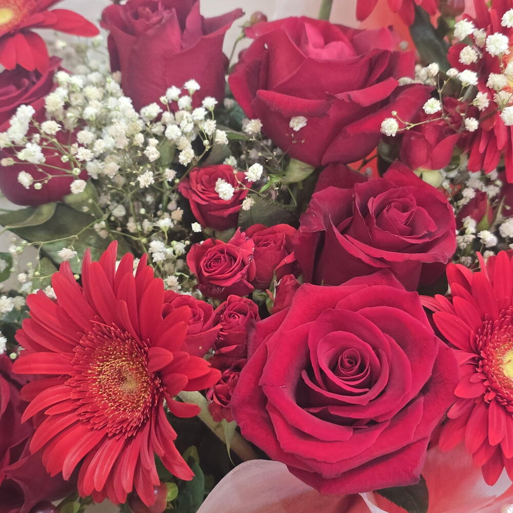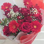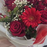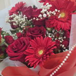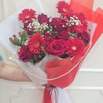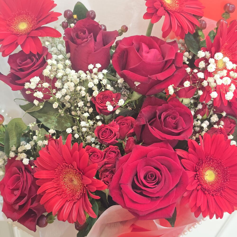 Gypsophila - 3 pcs rose red - 7 pcs wrapping paper - 5 pcs spray rose red - 4 pcs gerbera red - 5 pcs hypericum red - 5 pcs velvet ribbon - 1 pcs pearl chain - 1 pcs