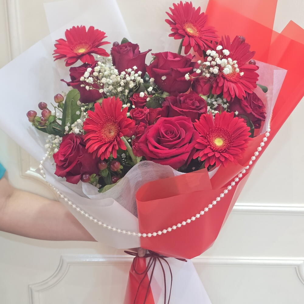 A professional studio shot of a premium red floral bouquet featuring deep red roses and vibrant Gerbera daisies. The arrangement is accented with white baby’s breath and red hypericum berries, elegantly wrapped in layered white and translucent red paper with a pearl-bead trim. Set against a clean, minimalist white background, this bouquet is perfect for Valentine’s Day, anniversaries, or romantic gifting.