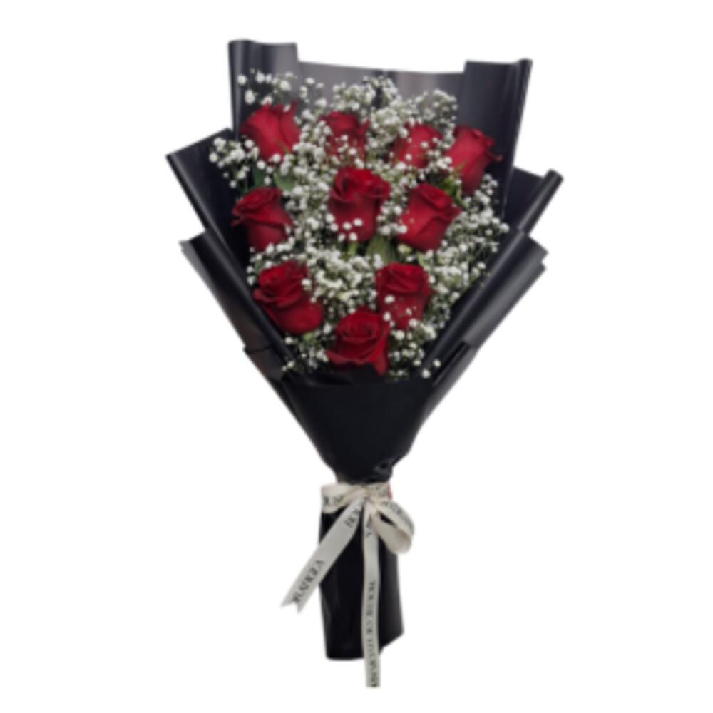 10 stems of premium grade red roses with fresh gypsophila handtied and wrapped with our luxury classic wrapping finished with bespoke ribbon