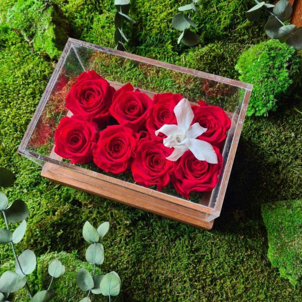 Moss - 1 pcs red infinity rose - 8 pcs white orchid - 1 pcs wooden rectangular box - 1 pcs
