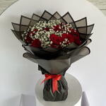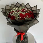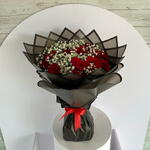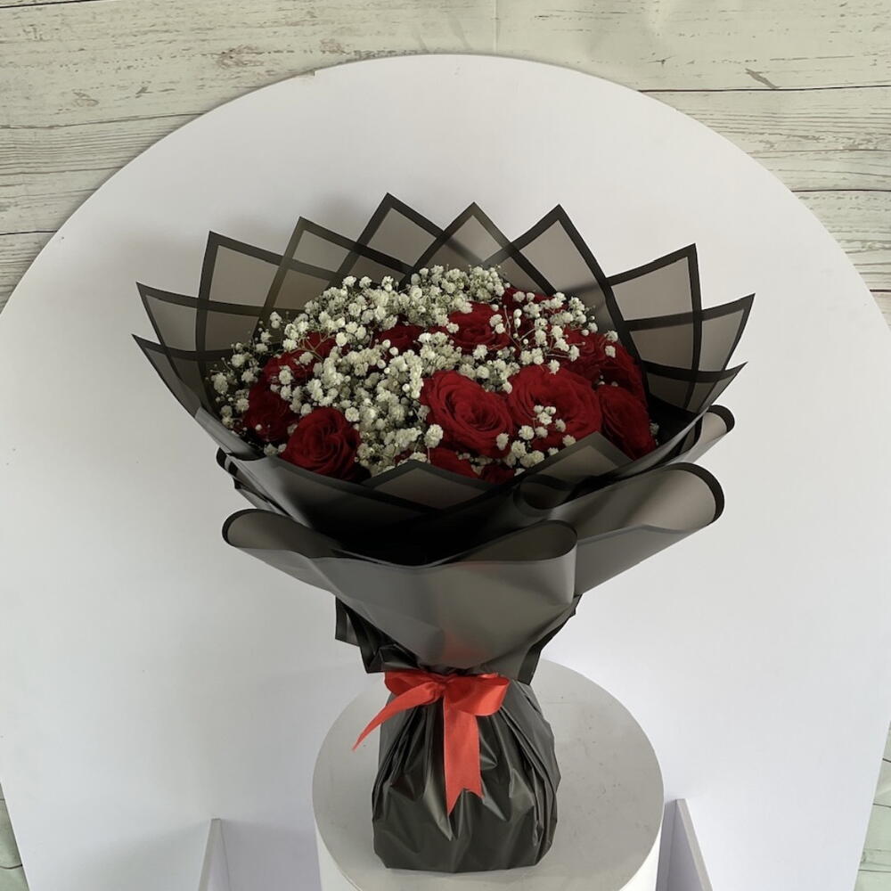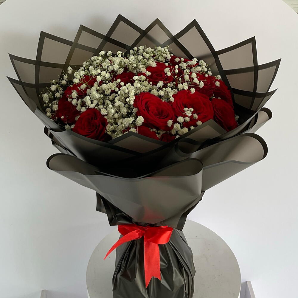 Immerse yourself in the enchanting allure of this Mono Bouquet. Comprised of 24 passionate roses, delicately accented with 5 sprigs of ethereal gypso and meticulously wrapped in 5 pieces of high-quality wrapping paper, this bouquet emanates an irresistible charm that is both captivating and unforgettable. Gift this impeccably curated bouquet to add an extra touch of elegance and romance to any occasion.