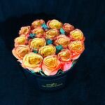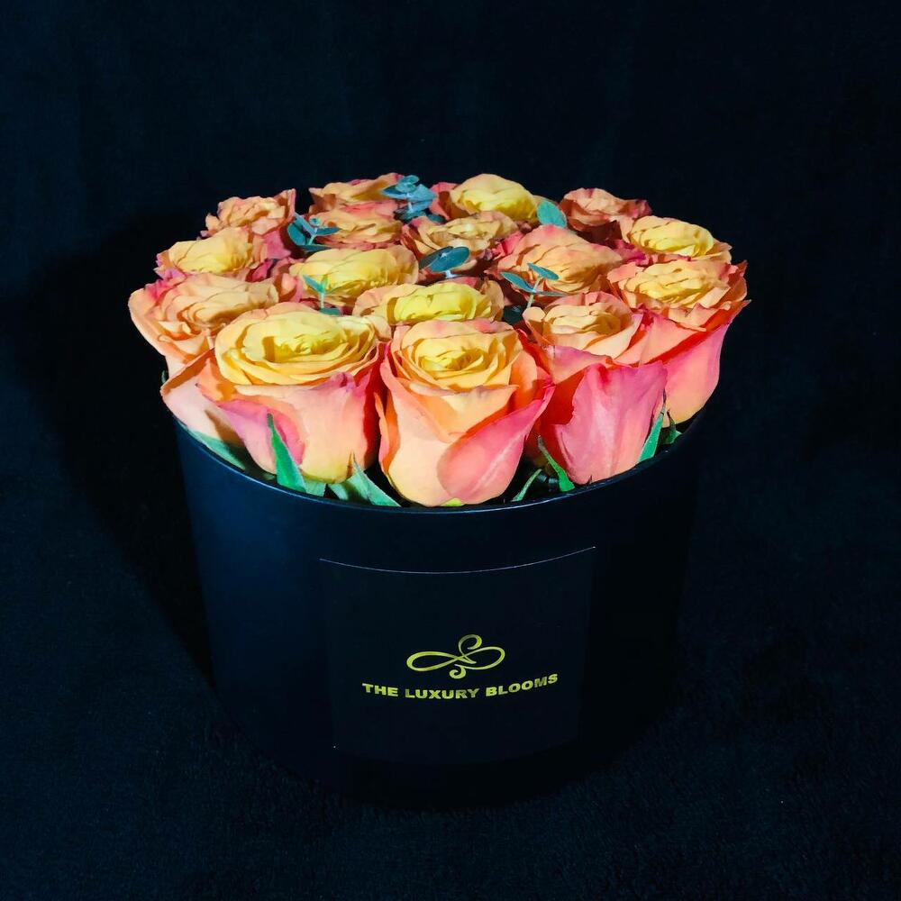 Black round box - 1 pcs fresh eucalyptus leaves - 1 pcs свежие оранжевые розы - 16 pcs