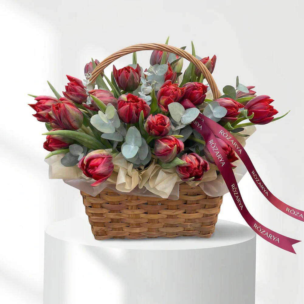 A stylish basket arrangement with rich red tulips and fresh eucalyptus. Bright, elegant, and modern, this floral design is a wonderful gift for birthdays, Valentine’s Day, women’s celebrations, and special occasions. • Please Note: As flowers are natural products, actual colors may vary slightly from digital images due to seasonal growth and lighting conditions. We guarantee that the overall style and premium quality as well as freshness of your arrangement will always be maintained.