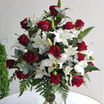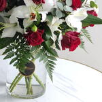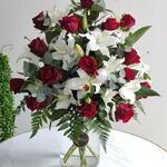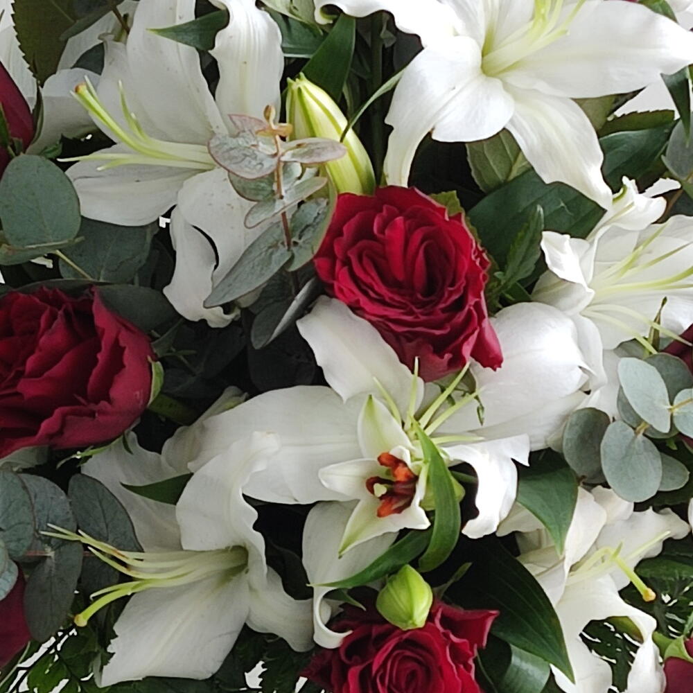 Red rose - 15 pcs Eucalyptus - 7 pcs White lilies - 5 pcs Vase - 1 pcs