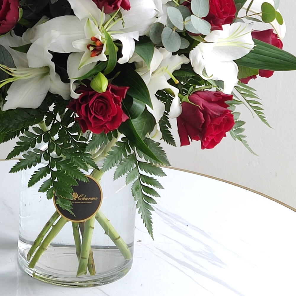 Introducing Crimson Lily Serenade — a breathtaking harmony of passion and purity. This luxurious arrangement unites 15 velvety red roses with 5 graceful white lilies, each bloom carefully placed to create a visual symphony of romance and elegance. Presented in a sleek glass vase, the composition feels timeless yet modern — bold reds expressing deep emotion, balanced by the serene beauty of flawless white lilies. It’s the perfect gesture for anniversaries, heartfelt celebrations, or any moment when ordinary flowers simply won’t do. A statement of love. A symbol of grace. A masterpiece crafted to touch the heart. Let your feelings speak beautifully — order Crimson Lily Serenade today and elevate your message with pure elegance.