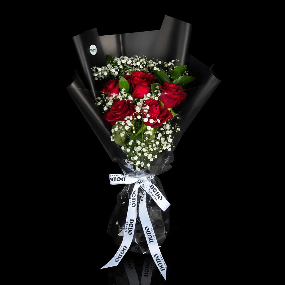 Red rose - 5 pcs Ruscus - 3 pcs gypso - 2 pcs