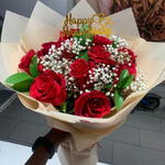 This elegant bouquet of red roses is a timeless gesture of love and admiration. Wrapped in a stylish matte kraft paper and tied with a bold red satin ribbon, it makes a sophisticated and heartfelt gift. The deep red roses are complemented by delicate sprigs of babys breath and lush eucalyptus leaves, creating a perfect harmony of romance and freshness. Keep the bouquet in a cool spot, away from direct sunlight, and change the water every 1–2 days for lasting freshness. Ideal for those special moments like birthdays, anniversaries, or any heartfelt occasion, this flower bouquet transcends the ordinary and becomes a tangible manifestation of love. Send it as a birthday gift, express anniversary wishes, convey get well soon sentiments, or simply wish a loving moment to someone dear. This luxurious arrangement is a grand gesture that speaks volumes, perfect for expressing timeless love and appreciation. Whether it’s a romantic gift, an anniversary surprise, or an unforgettable statement of affection, this bouquet makes every moment extraordinary. Anniversary, Birthday, Iam Sorry, New Baby, Suits any Occasion, Thank You, Wedding