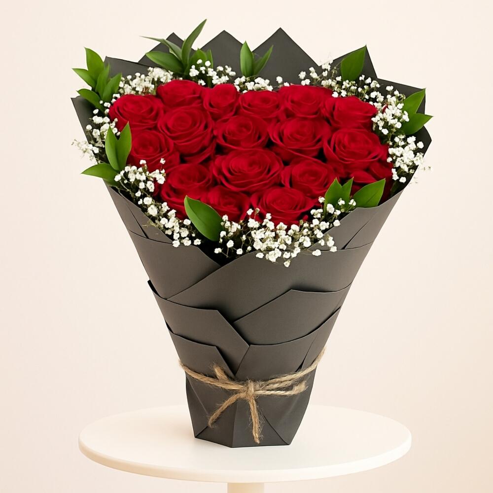 Red rose - 15 pcs Ruscus - 8 pcs gypsum - 4 pcs