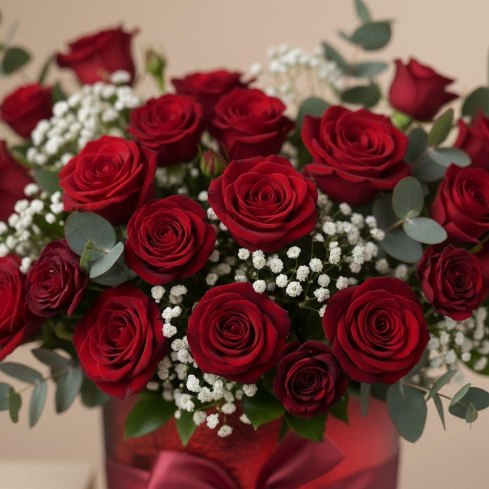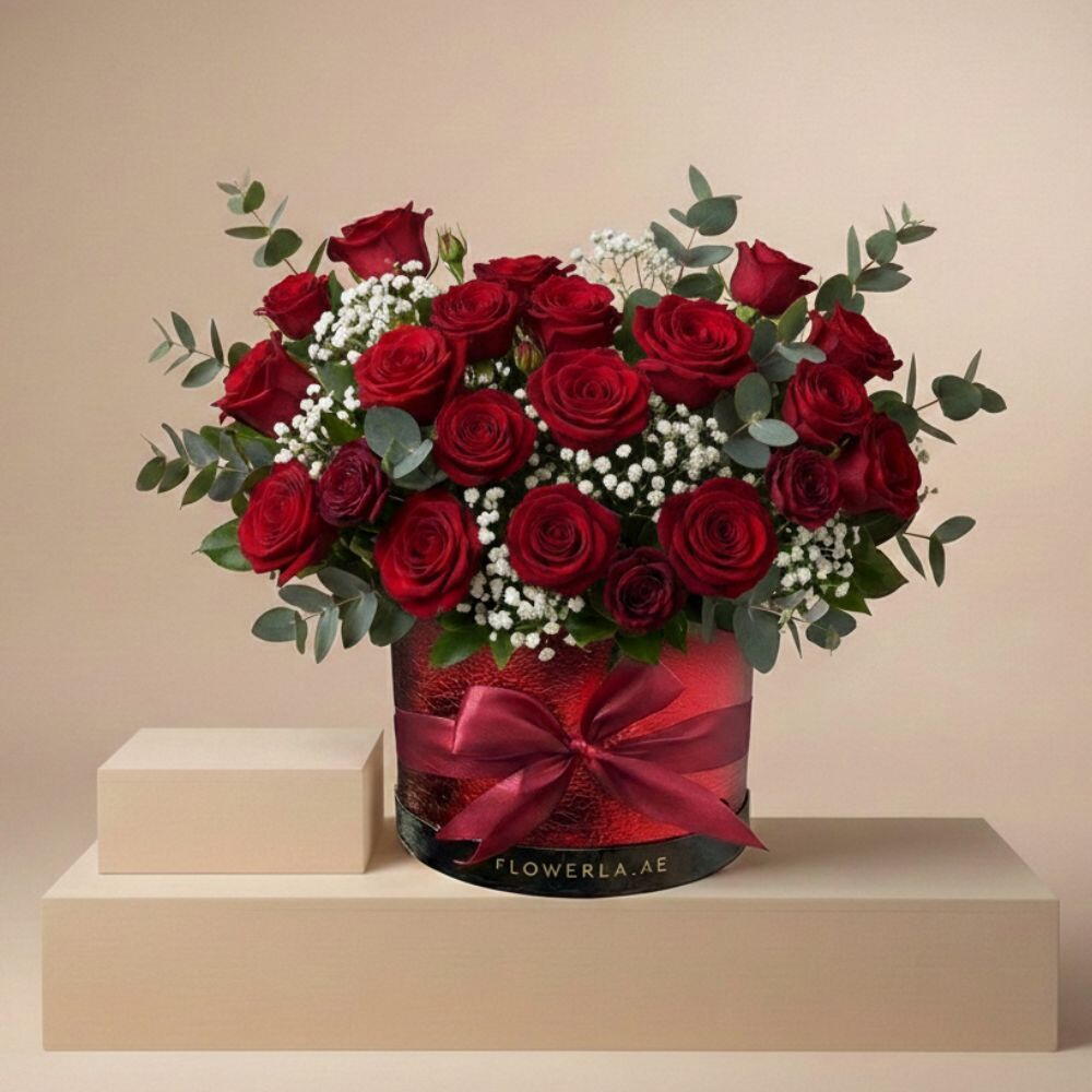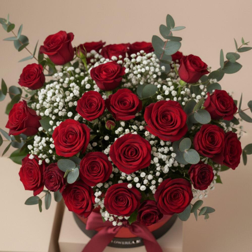 This elegant round flower box is beautifully arranged with premium red roses, delicately complemented by gypsophila and fresh eucalyptus greenery. Finished with a stylish ribbon, the arrangement creates a rich, romantic, and luxurious presentation. Perfect for expressing deep love and appreciation, this floral box makes a memorable gift for your wife, girlfriend, fiancée, or someone truly special. Flowers Included Premium Red Roses Gypsophila Fresh Eucalyptus Greenery Perfect For ❤️ Valentine’s Day 💌 Romantic Surprise 💍 Anniversary 🎁 Luxury Gift for Her 🌹 Proposal Moment