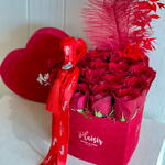 Red roses beautifully set in a luxury red velvet heart shaped box, designed to perfection with feathers and velvet ribbons and cameo and tassels, makes this a happy and loving gift for any occasion or for no reason at all, just to send some love over to someone special!