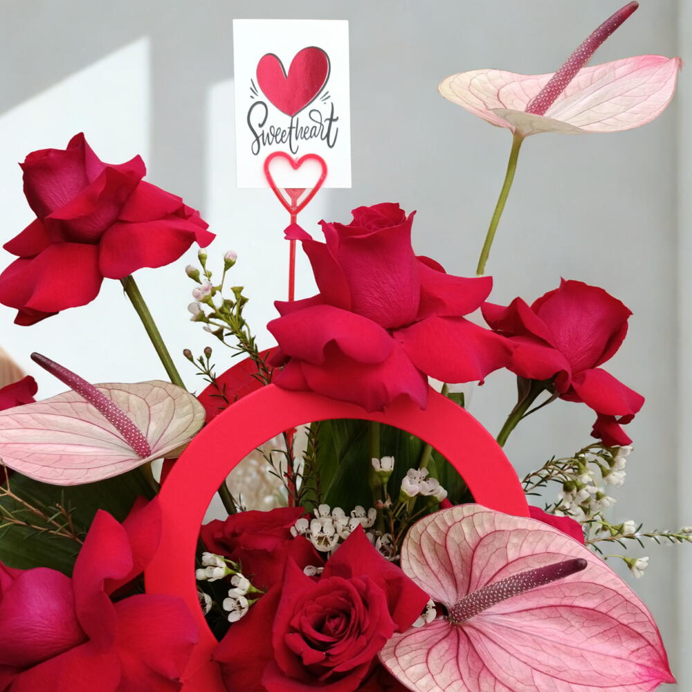 This charming flower bag arrangement features vibrant red roses paired with elegant pink anthuriums, designed to express love in the most stylish way. Presented in a premium red handbag-style box, it is perfect for Valentine’s Day, anniversaries, or heartfelt gifting.