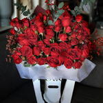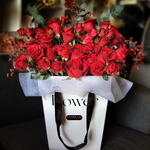 Red roses and baby roses flowers bouquet with a bag