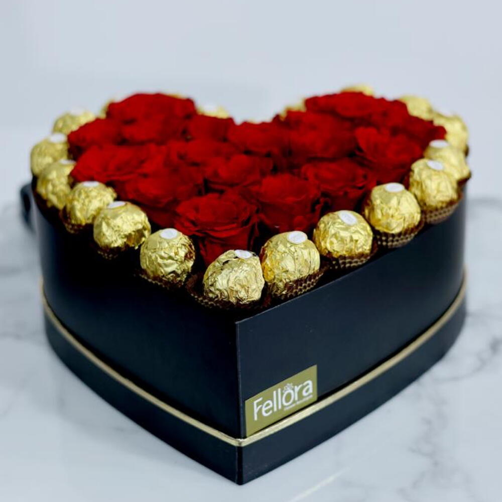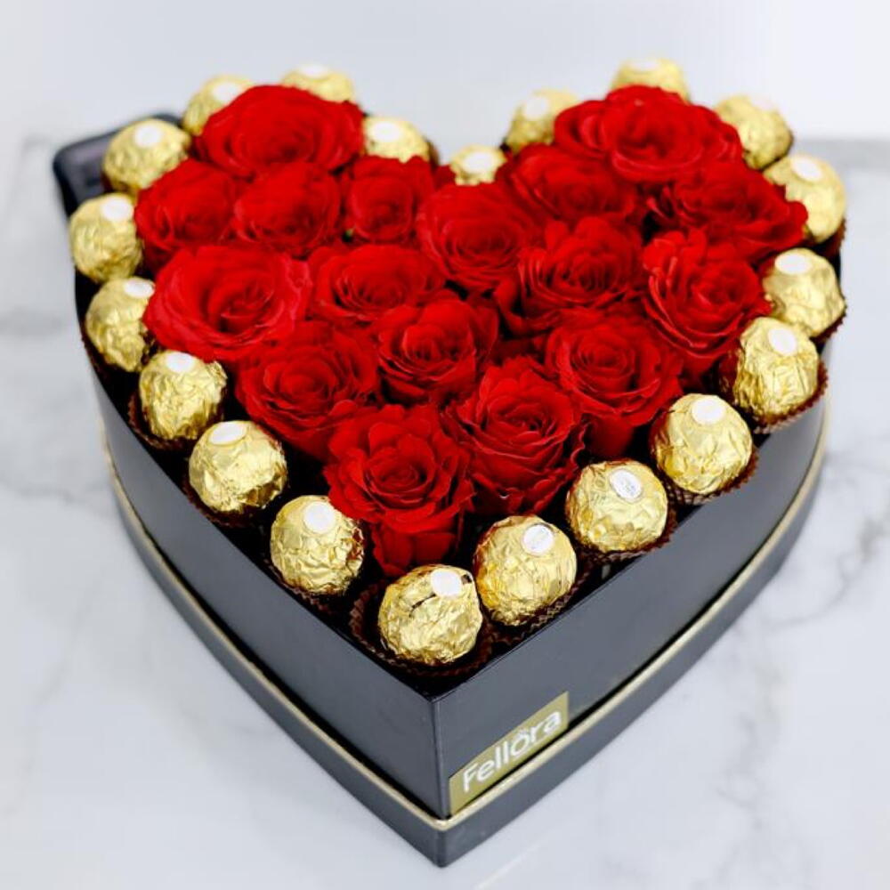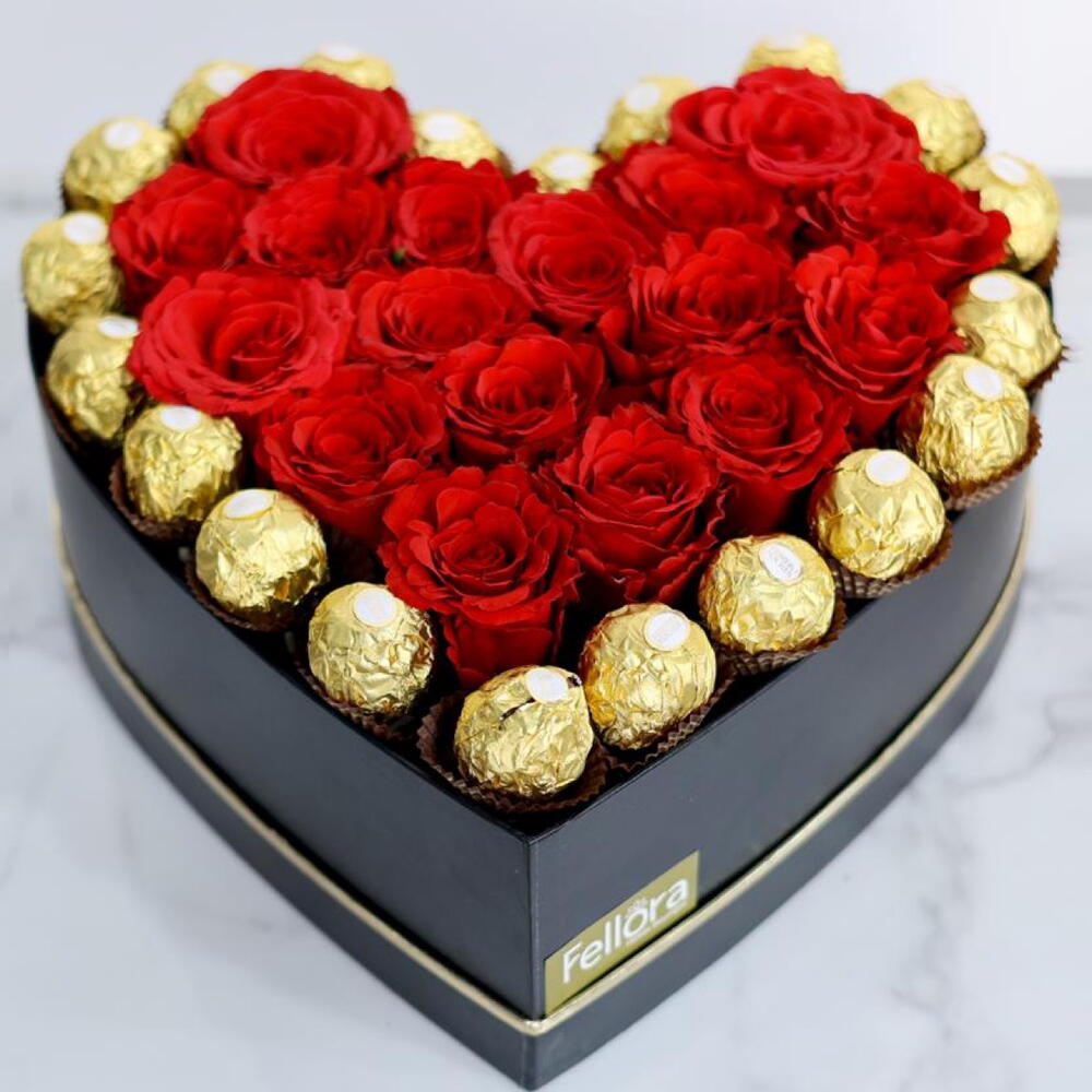 16 to 20 red roses and 20 pieces ferrero Rocher chocolates arranged in a medium heart shaped box