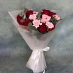 This extravagant Florists Special bouquet is composed of 9 luxurious red roses and 7 tender pink carnations, skillfully bundled together with 5 pieces of fresh greens. Each bouquet is thoughtfully wrapped in a sophisticated sheet and presented in a lovely gift bag, making it a perfect romantic gesture or a heartwarming present for any celebrations.