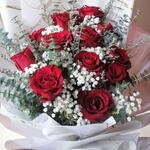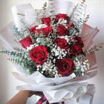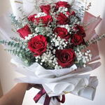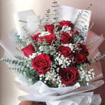 Red rose - 13 pcs Eucalyptus - 5 pcs Limonium - 5 pcs Gypsophila - 7 pcs