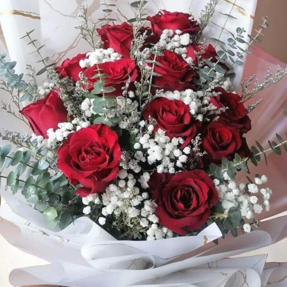 A timeless expression of love and elegance, this bouquet of classic red roses is beautifully complemented by delicate white gypsophila and silvery eucalyptus. Wrapped in luxurious white marble-effect paper with a hint of blush, it exudes romance and sophistication. Whether its for an anniversary, Valentines Day, or simply a gesture of affection, this bouquet will speak straight to the heart. To keep the bouquet fresh longer, trim the stems at an angle before placing them in clean water. Change the water every two days and keep the flowers in a cool spot away from direct sunlight or drafts.