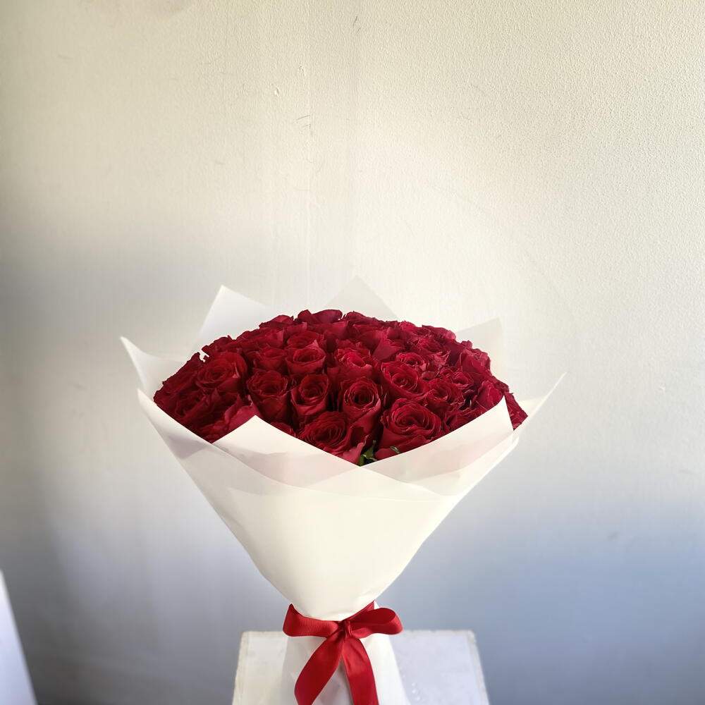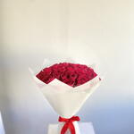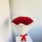 Immerse in the luxurious aura of this Mono Bouquet, meticulously assembled with 50 premium red roses. Exuding elegance and passion, these lush blossoms are sure to enchant any beholder, making it a perfect token of love, congratulations or appreciation. Elegantly bundled, these roses are not just a bouquet; theyre a sentiment expressed eloquently.