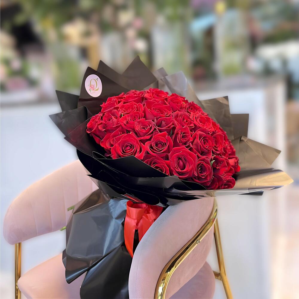 Indulge in the epitome of love and romance with our Florists Special - a breathtaking bouquet of 51 passionately red roses, meticulously handpicked for their remarkable beauty. Encased in ten sheets of elegant black paper wrap, each bloom is delicately cradled to create a dramatic backdrop, further accentuating the fiery hues and intricate petals. A single, sumptuous red ribbon binds the ensemble, adding that final touch of grandeur and elegance. Gift this bouquet to express an undying love, a fervent passion, or simply to make a loved ones day unequivocally special.