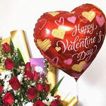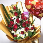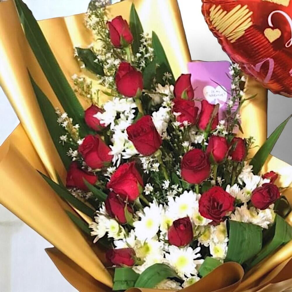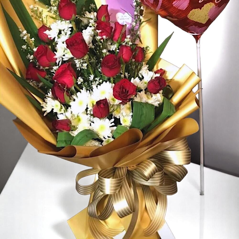 Celebrate love with this vibrant and elegant bouquet, beautifully wrapped in golden paper and tied with a luxurious satin bow. This stunning floral arrangement features a romantic blend of classic red roses and cheerful white daisies, accented with fresh greenery to enhance its natural charm. Perfectly complemented by a heart-shaped “Happy Valentine’s Day” balloon, it’s a delightful gift for someone special. Whether it’s for Valentine’s Day, an anniversary, or simply to express your love, this bouquet is sure to make hearts flutter. To keep the flowers fresh, trim the stems at an angle every two days, change the water regularly, and keep the bouquet in a cool, shaded area away from direct sunlight and heat sources.