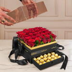 Elevate the art of gifting with our luxurious ensemble – 25 stems of passionate red roses paired with 16 pcs of Ferrero Rocher chocolates, artistically arranged in a sleek black box. Unleash romance on anniversaries, express love on Valentines Day, or celebrate special moments with this exquisite combination that transcends ordinary gifts.