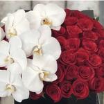 Red rose - 50 pcs white cut orchid palanopsis - 1 pcs basket - 1 pcs