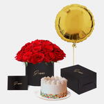 Experience pure elegance with our Red Roses in Box with Cake Bundle, featuring lush red blooms paired perfectly with a delicious cake for a truly romantic surprise.