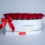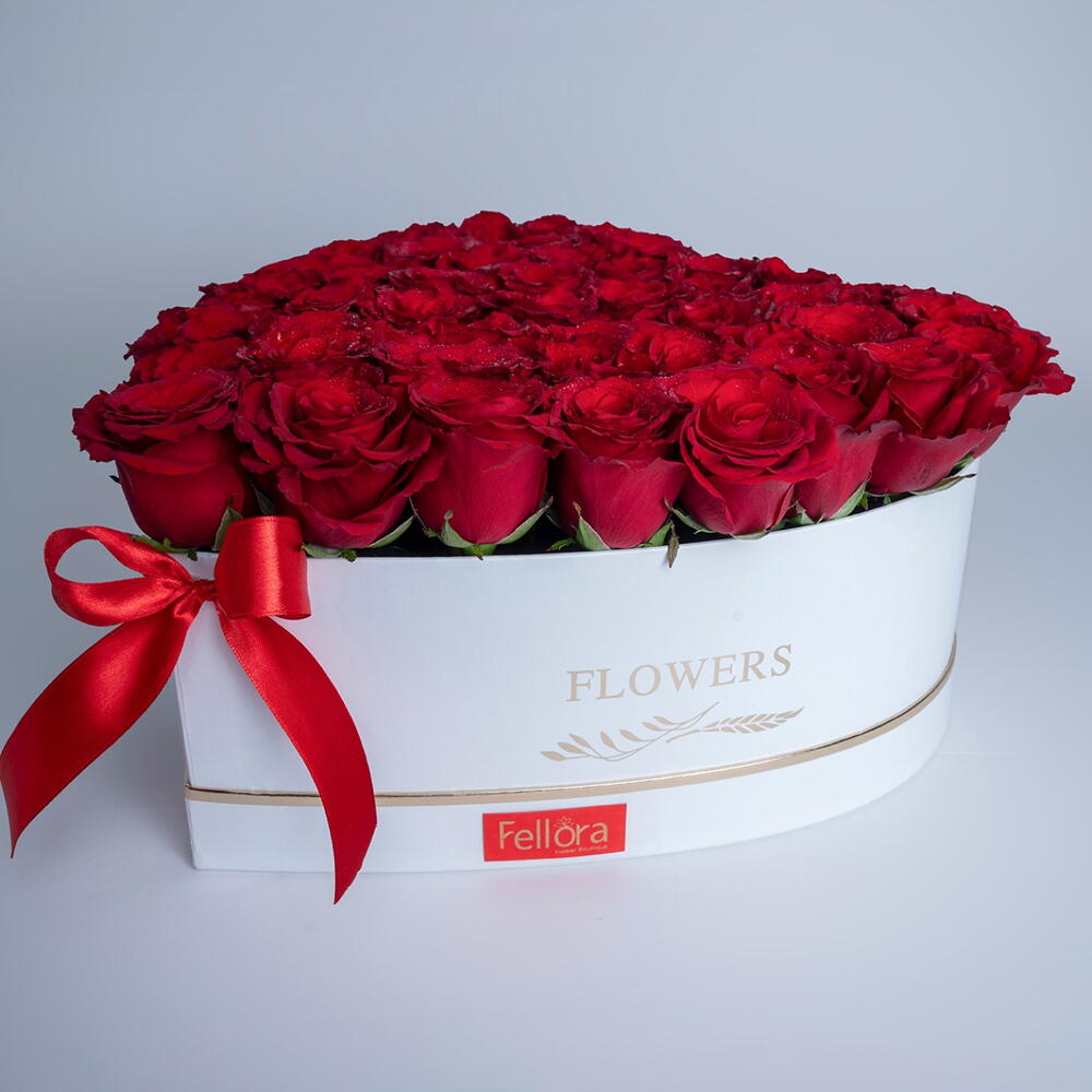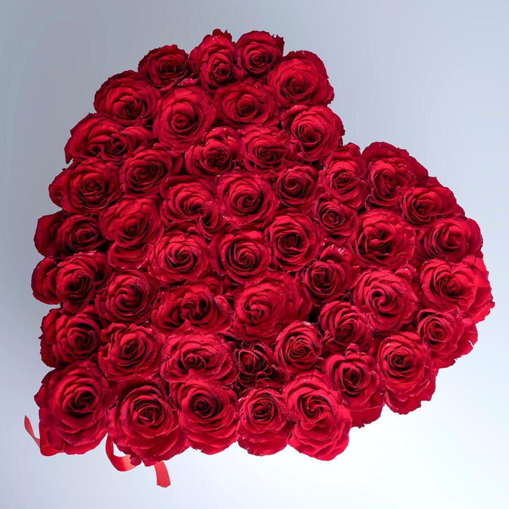 45 to 50 red roses arranged in a white heart box