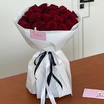 25 beautiful red roses in white wrapping.