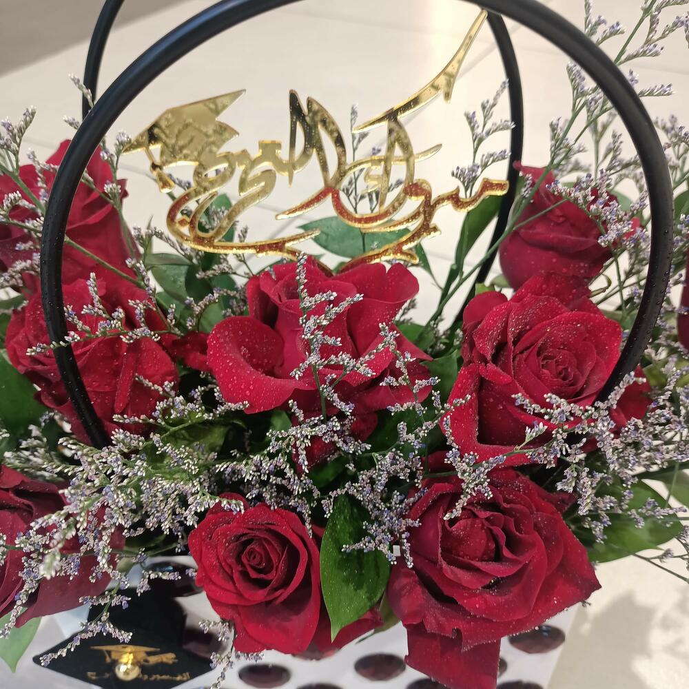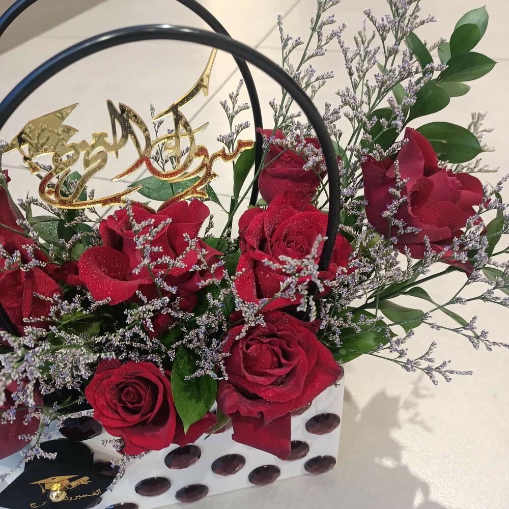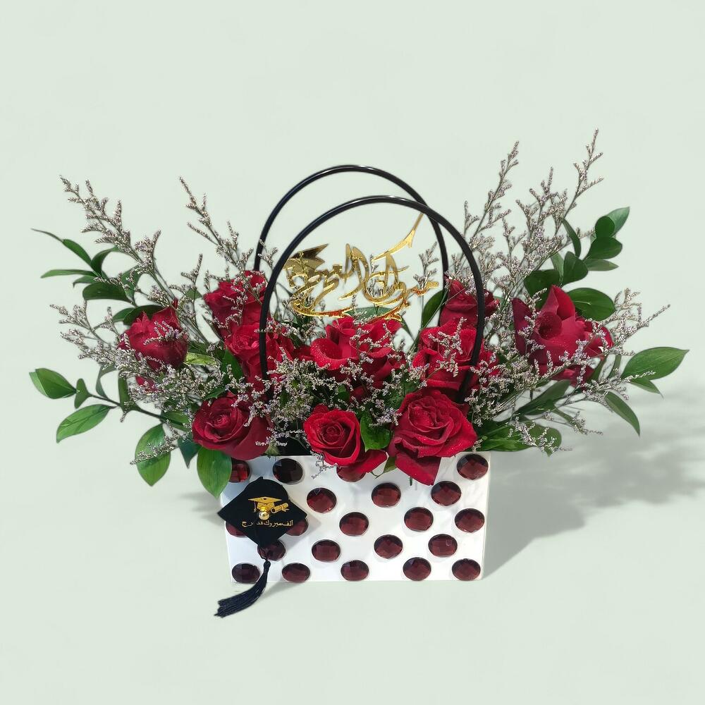 A vibrant arrangement presented in a stylish white basket with prominent red polka dots and elegant black handles. It features a lush display of rich red roses complemented by delicate white and green filler foliage. A golden Arabic Congratulations topper sits prominently, alongside a small graduation cap decoration with an Arabic inscription, making this a perfect and festive gift for a graduation celebration.