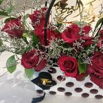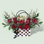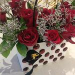 Limonium - 5 pcs roses - 10 pcs ruscuss - 6 pcs graduation cap - 1 pcs graduation acrylic topper - 1 pcs bag with front crystals - 1 pcs