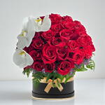 Red rose - 51 pcs Box - 1 pcs fillers - 5 pcs white phalaenopsis orchid - 1 pcs