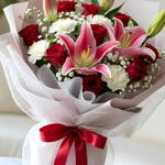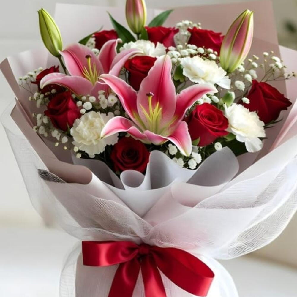Red rose - 9 pcs Gypsophila - 4 pcs white carnations - 4 pcs pink lilies - 2 pcs wrapping paper - 4 pcs