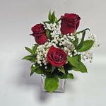 3 Red Roses with Ruscus and Gypsophila in a small Glass Vase.