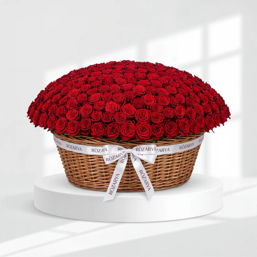 A breathtaking mono-arrangement of premium red roses set in a luxury wicker basket. Finished with our signature branded ribbon for an architectural statement of grand romance. The definitive choice for an unforgettable and unparalleled luxury floral experience. • Please Note: As flowers are natural products, actual colors may vary slightly from digital images due to seasonal growth and lighting conditions. We guarantee that the overall style and premium quality as well as freshness of your arrangement will always be maintained.