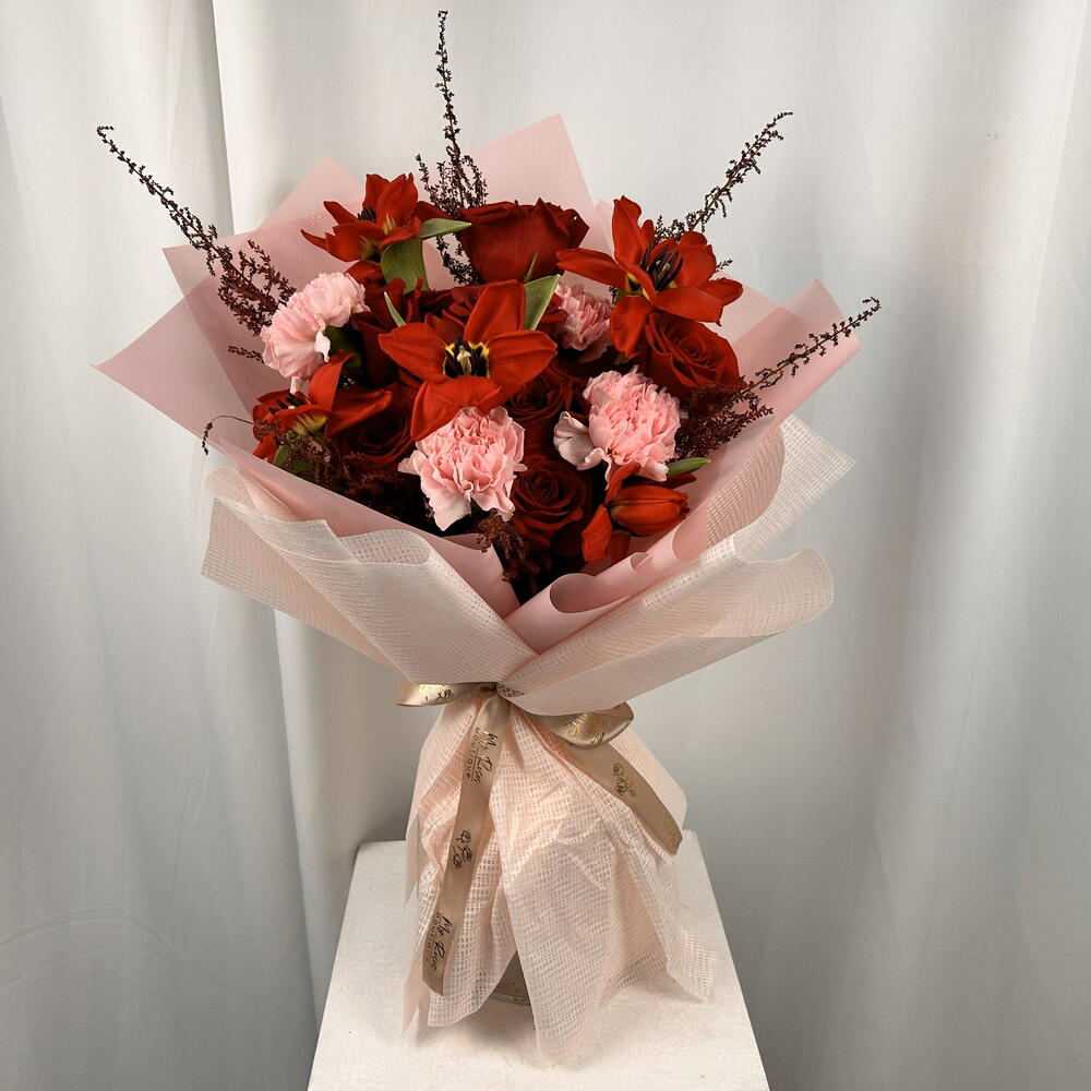 Red roses with red tulips and pink carnation bouquet