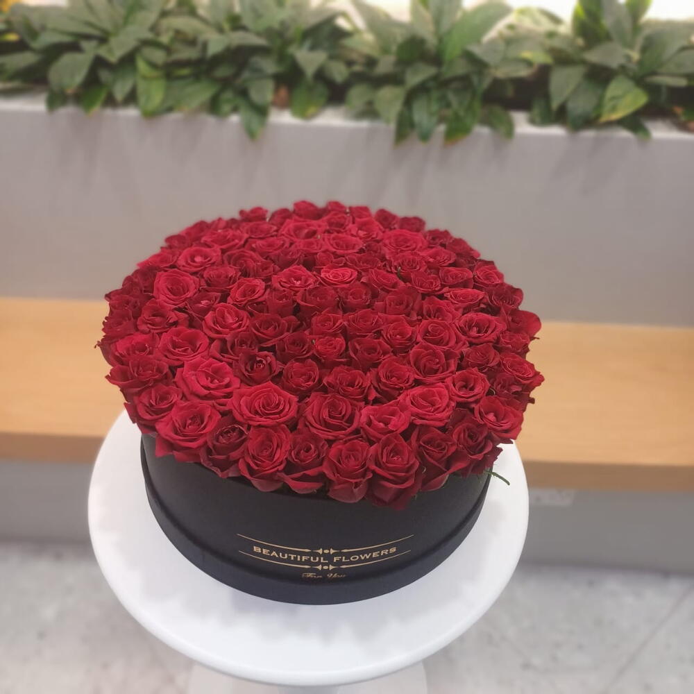Dive into the world of elegance with this exceptional arrangement of 100 vibrant red roses, immaculately assembled in a stylish box. This stunning floral centrepiece effortlessly encapsulates romance and sophistication, making it a perfectly versatile gift for any occasion. The sensation of opening this box to such a breathtaking surprise is genuinely unforgettable. Elevate your gifting experience with this captivating ensemble of the most passionately adored flower. Each rose is hand-picked for its vividity and vitality to ensure your unforgettable experience.