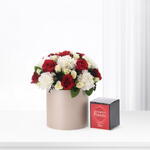 This refined arrangement features 12 red roses expressing deep love, paired with 10 white carnations symbolizing grace and admiration. Accented with 6 white spray roses, 3 black limonium, and 4 stems of ruscus greenery, it exudes contrast and elegance.Enhanced with a luxurious perfume pairing, Dior Hypnotic Poison — blending beauty, scent, and sophistication in perfect harmony.