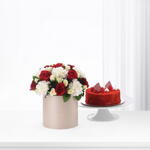A timeless blend of love and indulgence — the Red Sands Bloom Box Cake Combo features 12 red roses, 10 white carnations, and 6 white spray roses accented with black limonium and ruscus greens for refined elegance. Paired with a Half Kg Red Velvet Cake, this creation perfectly balances beauty and sweetness. Available in Black, White, Sand, and ZUVEES Signature Burgundy Boxes, it’s a luxurious gift designed to make every celebration unforgettable.