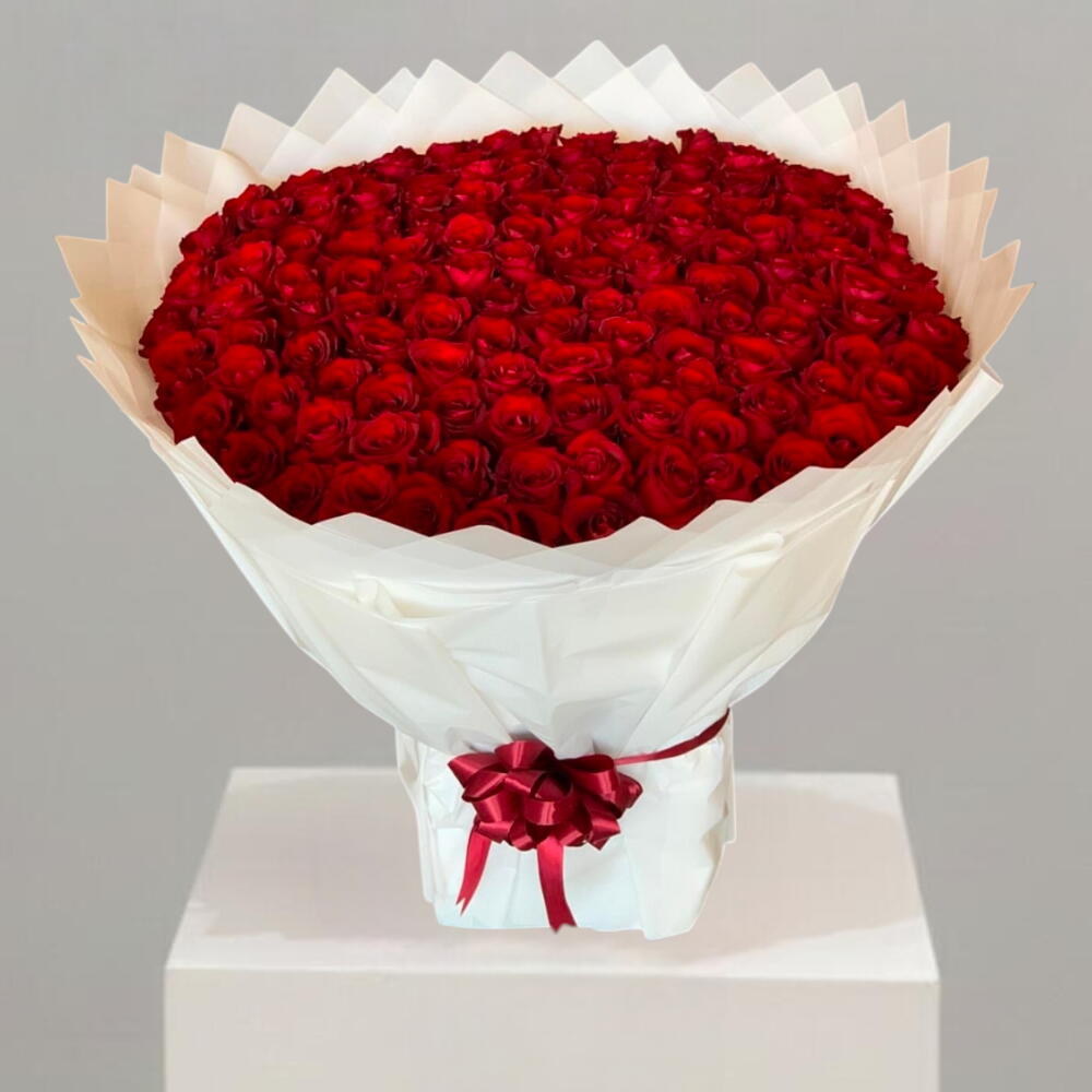 a luxurious and large bouquet of vibrant 201 red roses, elegantly wrapped in sleek black paper and secured with a bright pink or red ribbon. The rich, deep red petals symbolize deep love, passion, and beauty, making it a classic arrangement often associated with romantic gestures and special occasions like anniversaries or Valentines Day.